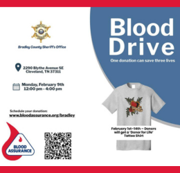 The Bradley County Sheriff’s Office is hosting a community blood drive with Blood Assurance on February 9th.