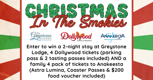 Enter to win a 2-night stay at Greystone Lodge, 4 Dollywood tickets (parking pass & 2 tasting passes included) AND a family 4 pack of tickets to Anakeesta (Astra Lumina, Coaster Passes & $200 food voucher included)